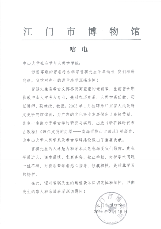 曾骐先生虚怀若谷、治学严谨、德高垂范、有教无类、春风化雨,为考古学界培养了一批中坚力量,为南方新石器考古研究、中山大学人类学系及考古学科建设作出了重要贡献。他的逝世,是中山大学人类学系和中国考古学界的重大损失。我们对曾骐老师的逝世表示最沉重的哀悼!