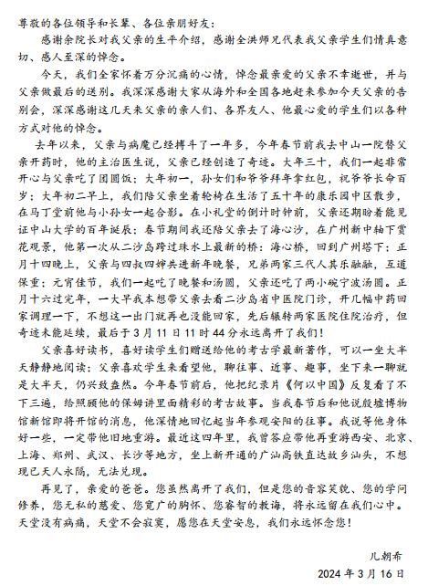3月16日下午,中山大学曾骐教授遗体告别仪式在广州殡仪馆仙鹤厅举行,逾百名师生好友从全国各地赶来,深切悼念曾骐先生。广东省有关部门领导、学校有关职能部门负责人、学院领导和师生代表等出席告别仪式,并向其亲属表示深切慰问。