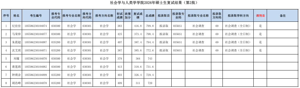 附件:社会学与人类学学院2026年硕士生复试结果(第2批)