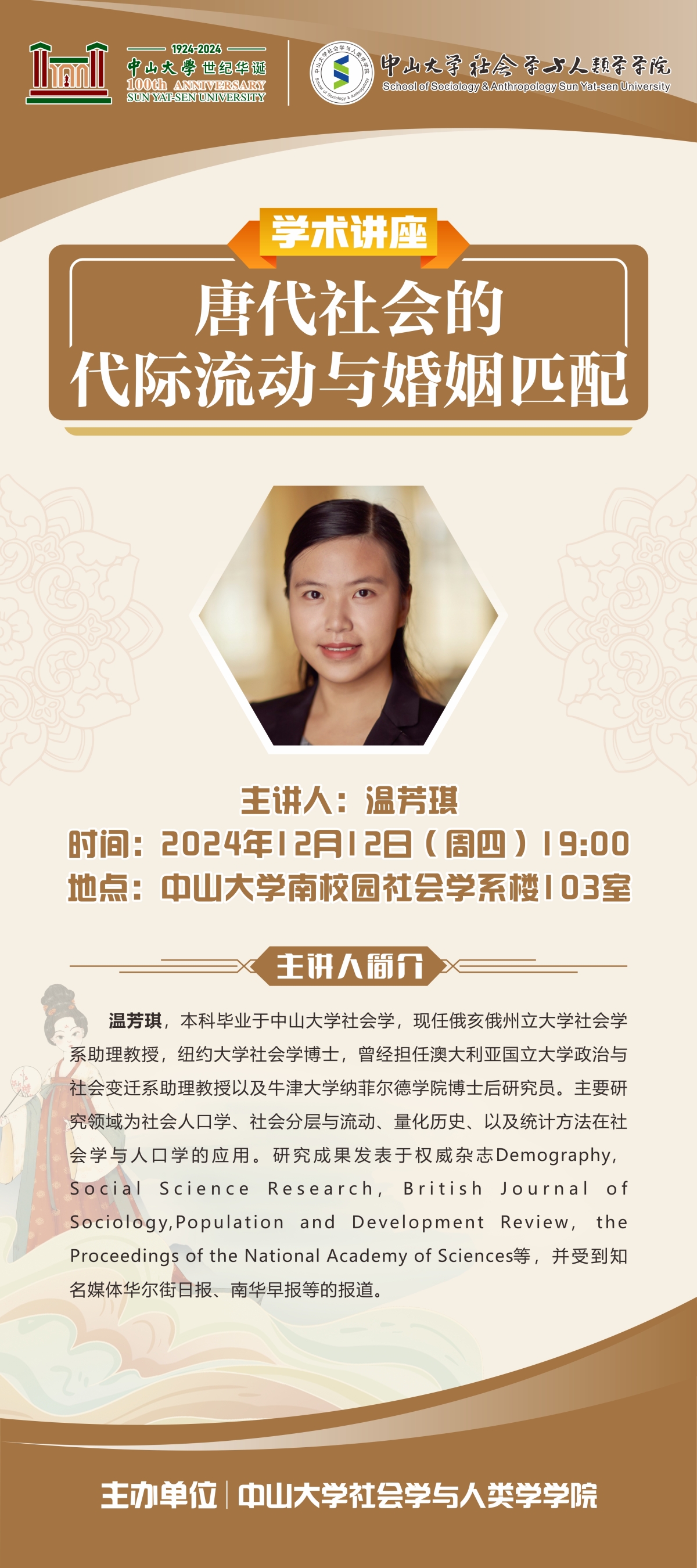 主讲人简介:温芳琪,本科毕业于中山大学社会学,纽约大学社会学博士,现任俄亥俄州立大学社会学系助理教授,曾经担任澳大利亚国立大学政治与社会变迁系助理教授以及牛津大学纳菲尔德学院博士后研究员。主要研究领域为社会人口学、社会分层与流动、量化历史、以及统计方法在社会学与人口学的应用。研究成果发表于权威杂志DemographySocial Science ResearchBritish Journal of Sociology,Population and Development Reviewthe Proceedings of the National Academy of Sciences等,并受到知名媒体华尔街日报、南华早报等的报道。